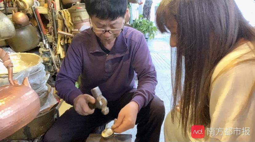 西关打铜,是广州地区传统工艺,由手工匠千锤百炼而成的铜器皿,曾经是广州每家每户必备之物。“其实之前有听说过打铜,但在香港一家很少见到这门手艺了,之前听说在香港的旺角还有一个老师傅在打铜,其他地方就很少见到类似店铺了。但我知道广州的西关打铜特别有名,今天一定要体验一次。”