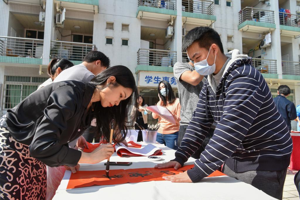 上午11点,学校生活区装扮一新,在一个可爱的大型年味布景前面,同学们正在举办“杏林年味铺”活动,写春联、领福字、抽大奖……现场一片欢乐,俨然已经是过年的气氛。