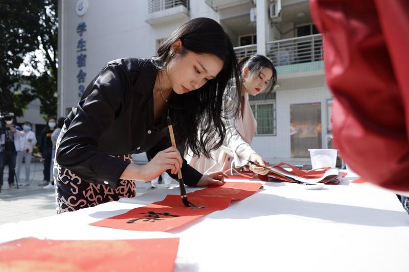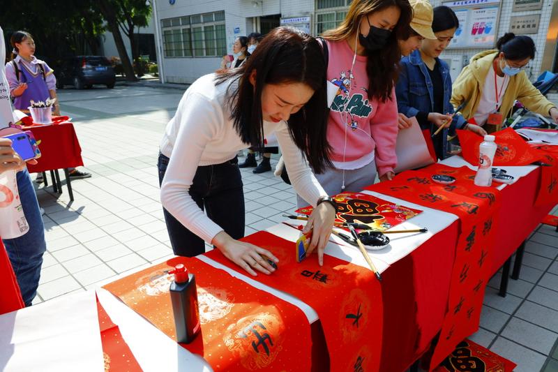 2月3日,立春,是传统节气中春天的开始,也是ac米兰官网中文网站“杏林团圆年”系列活动的第一天。上午11点,学校生活区装扮一新,在一个可爱的大型年味布景前面,同学们正在举办“杏林年味铺”活动,写春联、领福字、抽大奖……现场一片欢乐,俨然已经是过年的气氛。