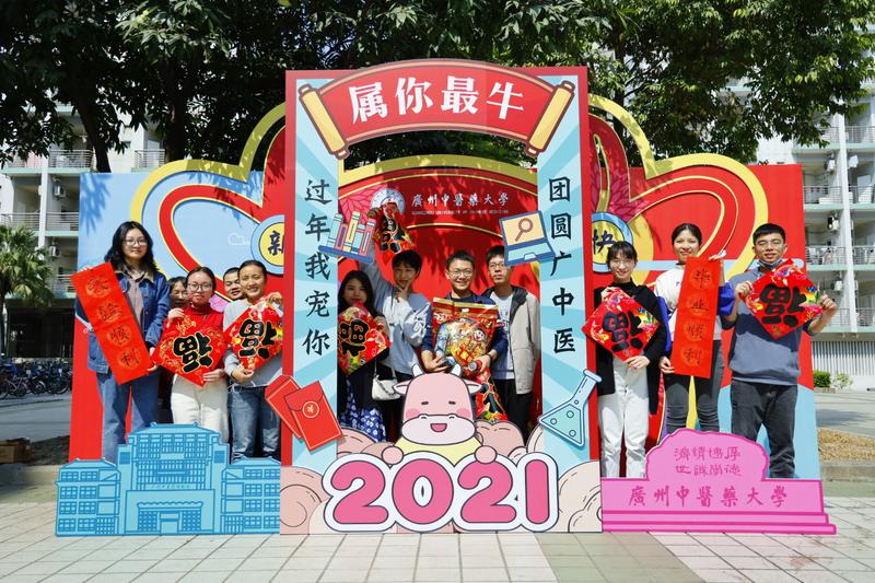 “我早早就知道这个活动啦,”现场一位同学说,“没想到在学校过年也这么好玩!马上发朋友圈!”她抱着刚抽到的一大包零食和广中医定制台历,在年味布景前不停地拍照。