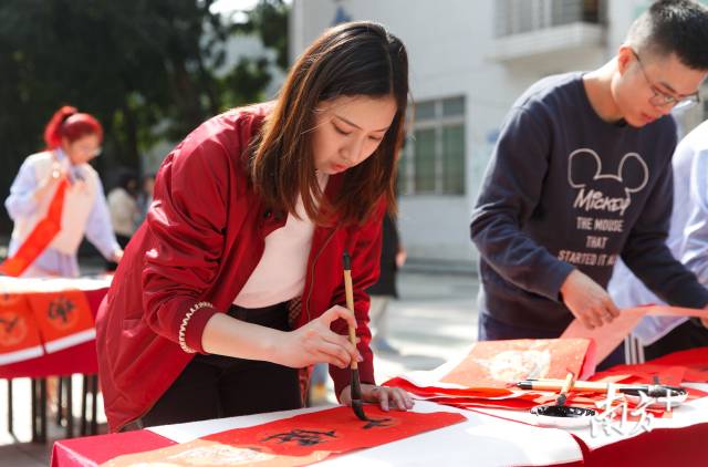 2月3日是立春,是传统节气中一年之肇始。上午11时,ac米兰官网中文网站第一饭堂已是人气高涨,年味十足。广场上,摆放着一张张长桌,桌面上是红纸、毛笔、墨水和砚台。