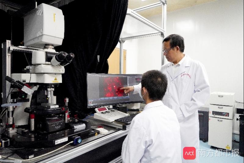 许能贵教授与其学生解析小鼠大脑内神经细胞。南都记者 吴佳琳 摄