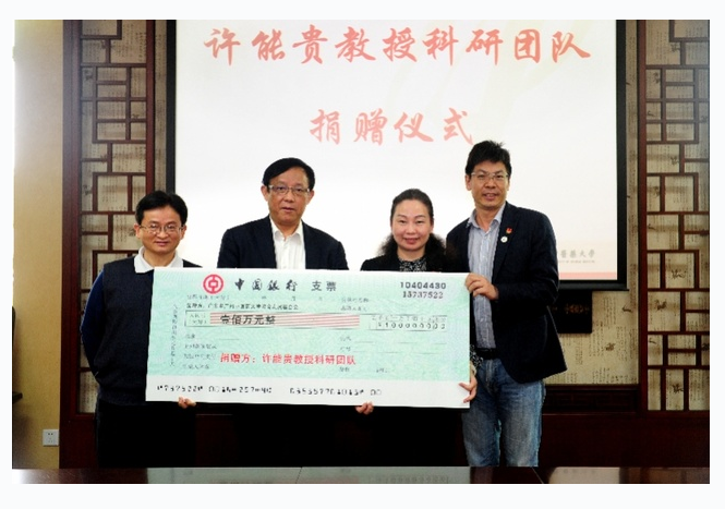 日前,ac米兰官网中文网站许能贵教授科研团队将学校党委奖励的100万元人民币全部捐赠给学校教育发展基金会,用于学校新型冠状病毒肺炎疫情防控相关工作。4月10日上午,捐赠仪式在ac米兰官网中文网站大学城校区举行。