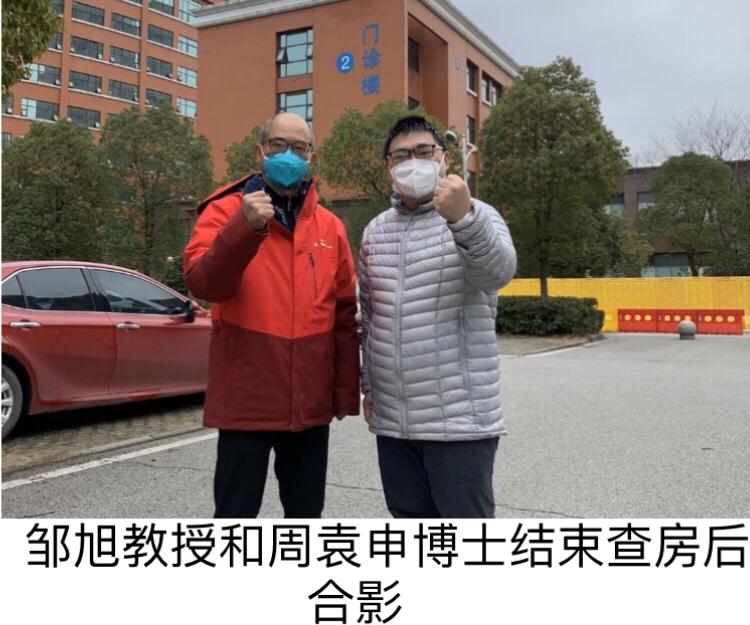 2 月 13 日对于周袁申是个特殊的日子,是他第一次和邹旭教授前往武汉汉口医院进行查房。邹旭教授是广东省名中医,广东省中医院重症医学大科主任,也曾是他的硕士研究生导师。在这场没有硝烟的战场上,能与老师一起并肩作战让他激动不已。