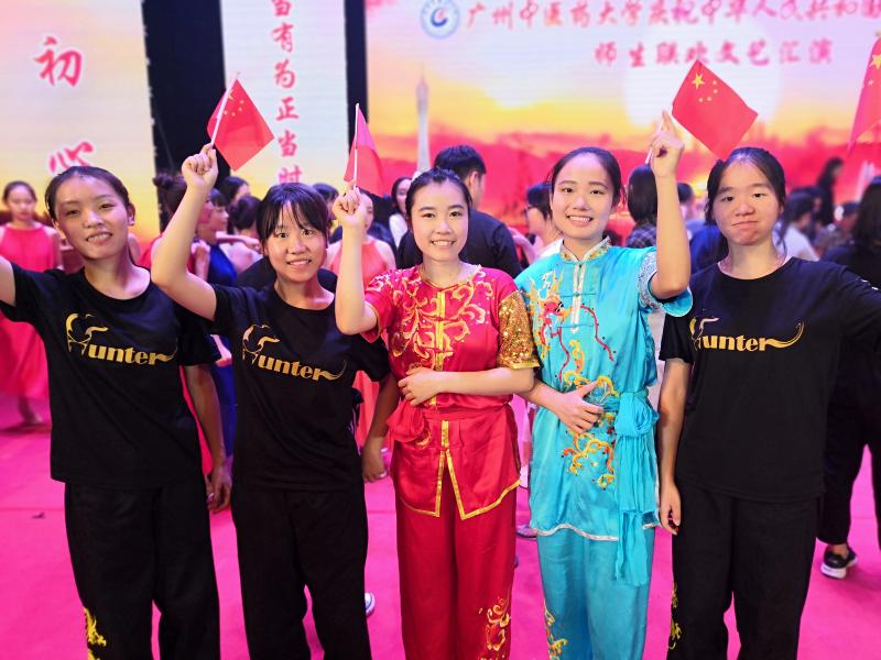 何泳仪(中)参加大学庆祝新中国成立70周年文艺汇演活动。受访者供图