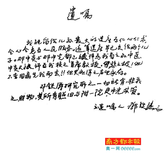 邓铁涛的遗书也在当日上午开封。他在遗书中说:“我施留给儿孙最大的遗产是仁心仁术,全心全意为人民服务。这笔遗产早已交给两个儿子……邓铁涛研究所之一切所有非我之财物,其所有照旧与附一院及中光共管”。