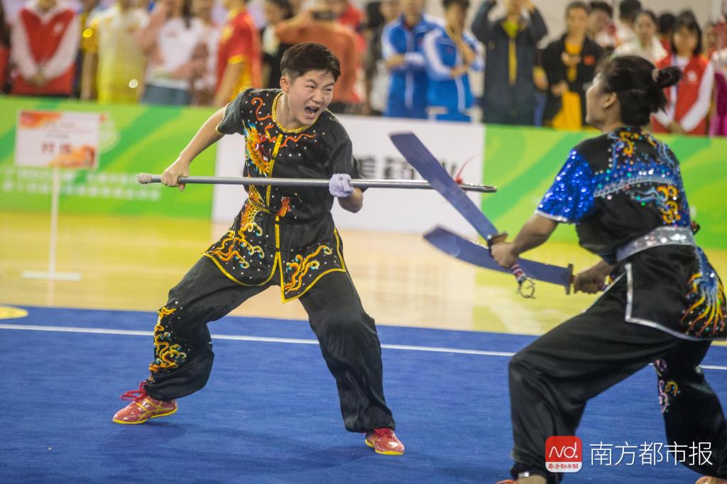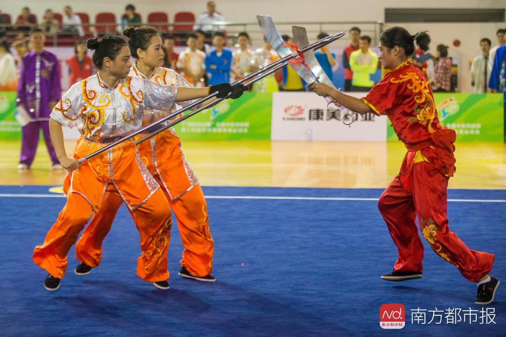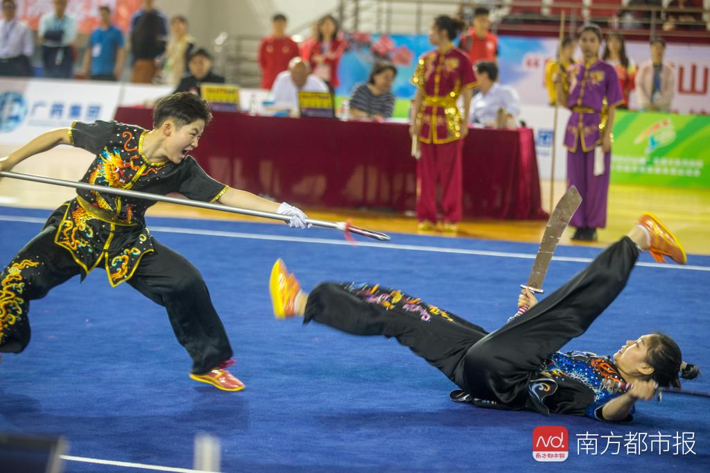 南都记者在比赛现场看到,对练项目分为男子女A、B组比拼,A组为武术特长生,B组为上大学后才练习武术的学生。其中女子对练的比赛更为精彩,“武林小姐姐”们各自上演一套预先编排好的打斗,徒手比拼的有太极推手、南拳斗螳螂,器械打斗的有双刀进枪、双刀进双枪、三节棍进棍,现场还不乏00后选手的身影。比赛中女子选手们踢打、跳跃、跌扑、翻滚,还配合着喊声和表情,巾帼不让须眉,让现场观众频频鼓掌叫好,ac米兰官网中文网站的选手胡墅婷更是在双刀进枪的比赛中受伤,最后带伤坚持成了全套动作。