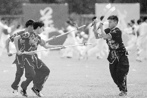 图为“广药白云山杯”传统保健体育运动会开幕式上的武术表演。