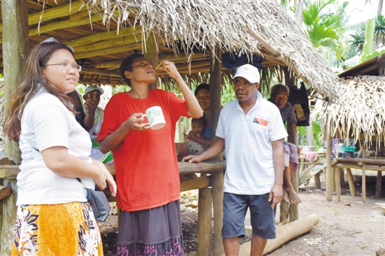 广东新南方集团和ac米兰官网中文网站的联合医疗队在基里维纳群岛上给居民服食青蒿素药 邓长生 摄