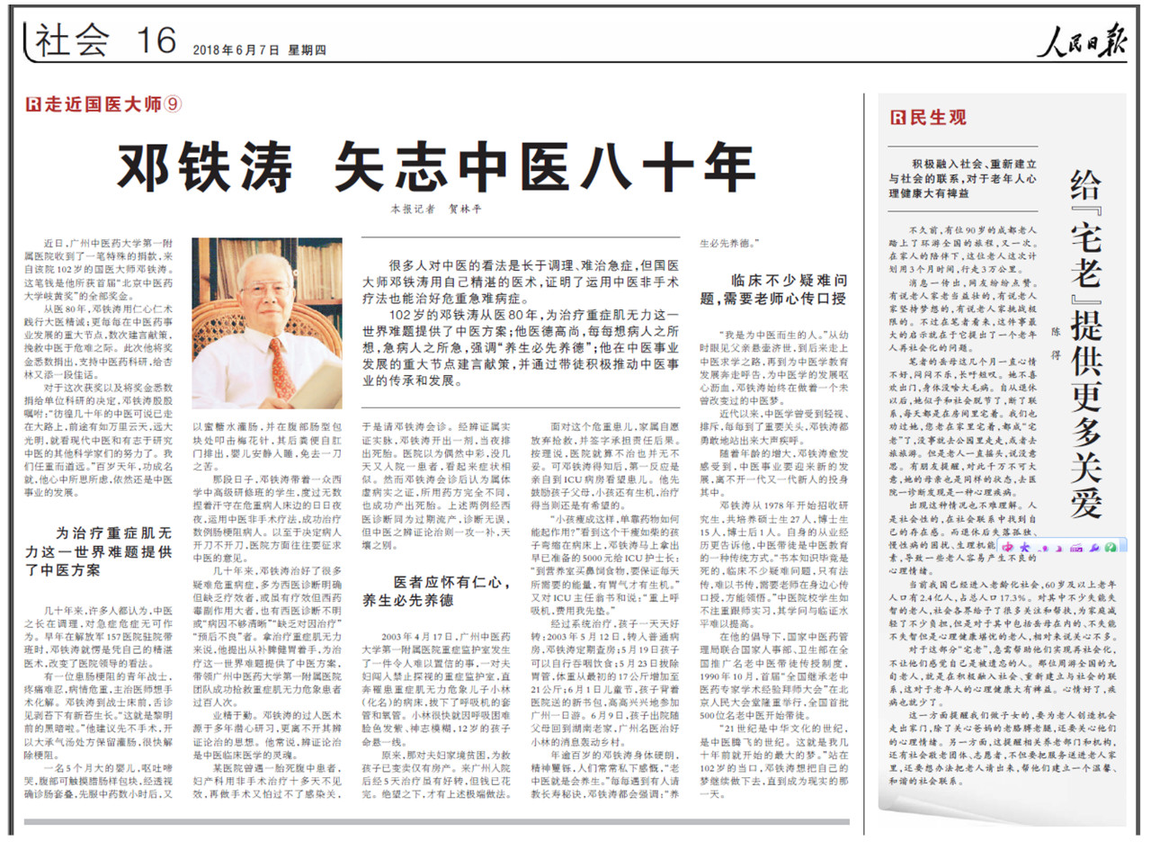 《人民日报》2018年6月7日第16版,刊登走近国医大师系列文章《邓铁涛 矢志中医八十年》,讲述了首届国医大师、ac米兰官网中文网站第一附属医院邓铁涛教授为发展中医药事业、造福人类健康作出的巨大贡献。