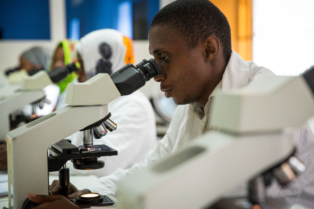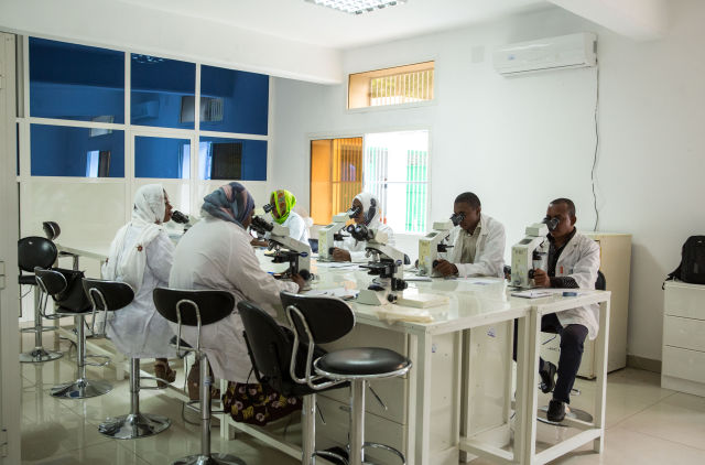 4月17日,在科摩罗大科摩罗岛,当地科研人员检查当地居民血液样本。新华社记者 吕帅 摄