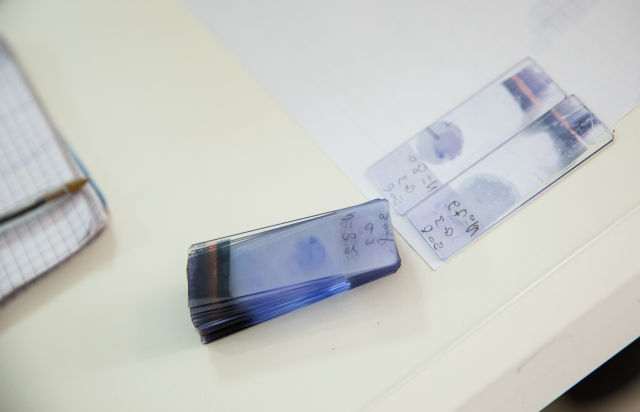这是4月17日在科摩罗大科摩罗岛拍摄的当地居民血液样本玻片。新华社记者 吕帅 摄