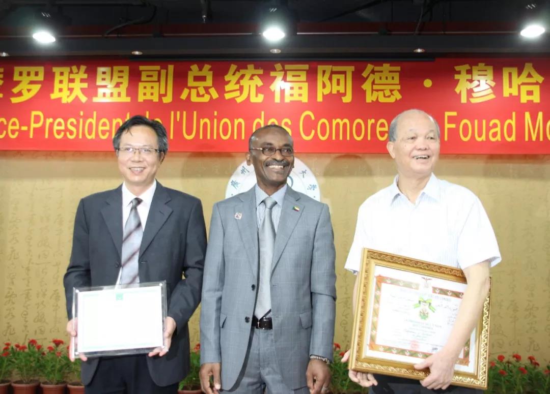 ▲2013年8月21日,科摩罗联盟副总统兼卫生部长福阿德·穆哈吉来到广州,为帮助科摩罗清除疟疾作出重要贡献的李国桥和宋健平颁发总统奖章,这是该奖章首次颁给外国教授。