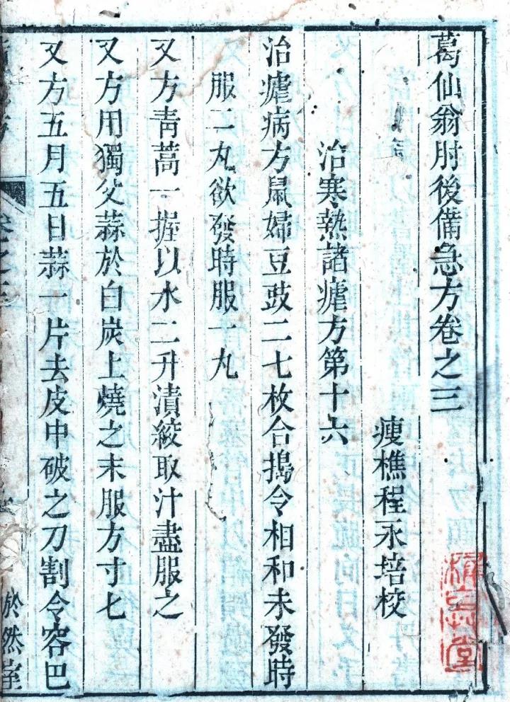 ▲晋·葛洪《肘后备急方》中“青蒿一握,以水二升渍,绞取汁,尽服之。”短短15个字,直接启发了屠呦呦发现青蒿素 (图片来源:广东中医药博物馆藏本)