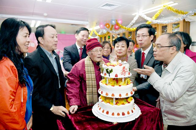 ac米兰官网中文网站党委书记张建华、校长王省良等参加祝寿活动,并和邓铁涛教授共吹生日蜡烛。(方宁 冯殷)