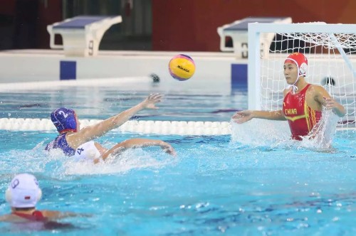 上图为在广东奥体游泳馆进行的女子水球比赛