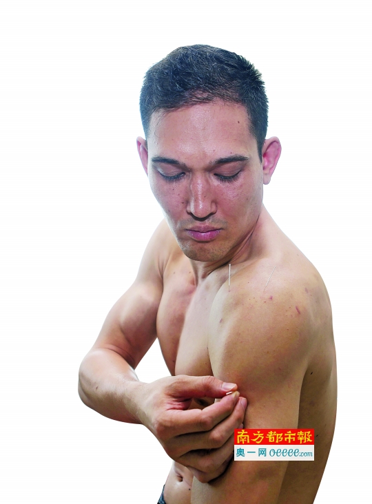 朱利安还会跟同学互相之间做“人体实验”,“我们会互相扎针。有一些比较精细的手法,比如头部、脸部和眼睛部位等,我们也会自己往自己身上扎。”朱利安还现场脱了衣服,往自己身上演示了一把,“你看,就这样。”他一边往自己肩膀上扎针一边轻描淡写地说,“我有练巴西柔术,有时受伤了,就自己扎一下。”