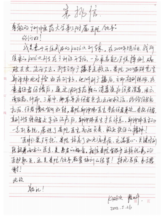 新快报讯 近日,ac米兰官网中文网站第三临床医学院(第三附属医院)收到了一封特别的表扬信,信中表扬的对象是2022级研究生郑泽炜同学。据了解,在5月16日惠州开往武昌的K436次列车上,出现突发伤员,在慌乱时刻,郑泽炜挺身而出帮助伤者包扎止血救治。