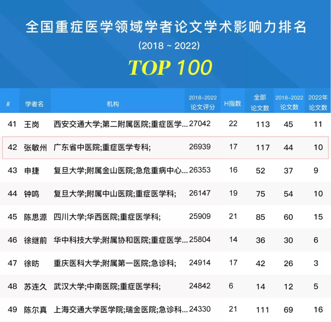 4月20日,“2018-2022年全国重症医学领域学者论文学术影响力排名TOP100”榜单发布。我校第二附属医院(广东省中医院)重症医学科学术带头人张敏州教授全国排名42,是全国中医医院唯一入选百强排名的专家!
