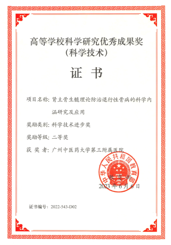 第三附属医院黄宏兴教授参与的“肾主骨生髓理论防治退行性骨病的科学内涵研究及应用”项目荣获教育部科学技术进步奖二等奖