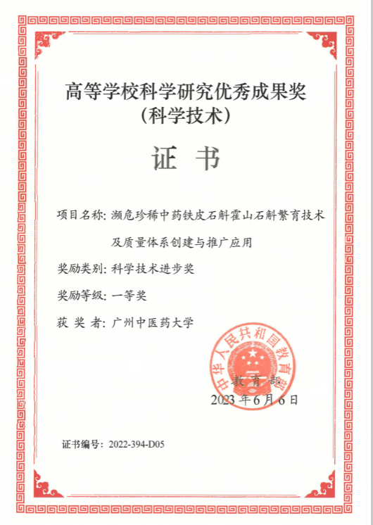 中药学院黄松教授参与的“濒危珍稀中药铁皮石斛霍山石斛繁育技术及质量体系创建与推广应用”项目荣获教育部科学技术进步奖一等奖