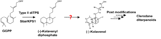 二萜合酶(DiTPS)是二萜生物合成分支中的第一个关键酶,催化二萜前体GGPP环化生成二萜骨架。被子植物通常利用II类和I类两个不同的单功能diTPS通过串联催化生成二萜骨架,首先由II类diTPS环化GGPP生成二环中间体,随后I类diTPS负责脱焦磷酸同时进行二次环化或骨架重排。然而,在二环二萜的生物合成中,是否由I类diTPS完成中间产物的脱磷酸步骤,一直存在争议。