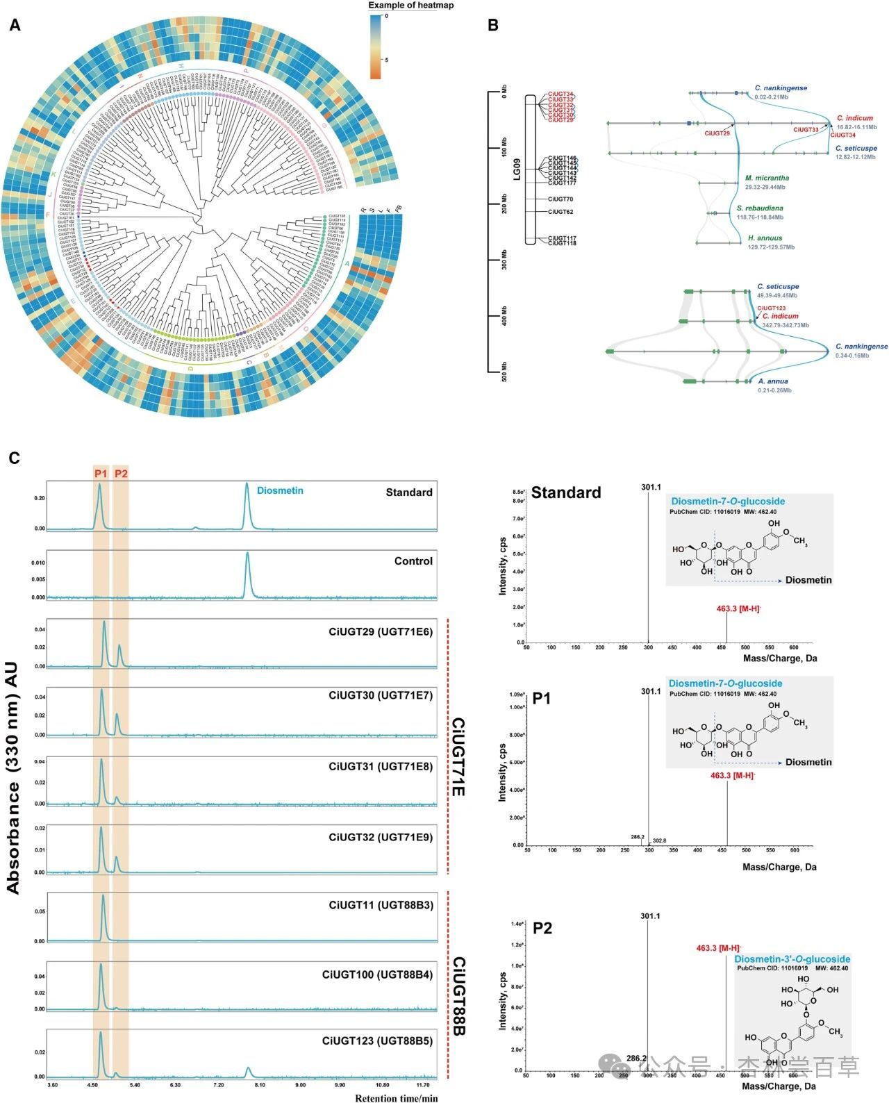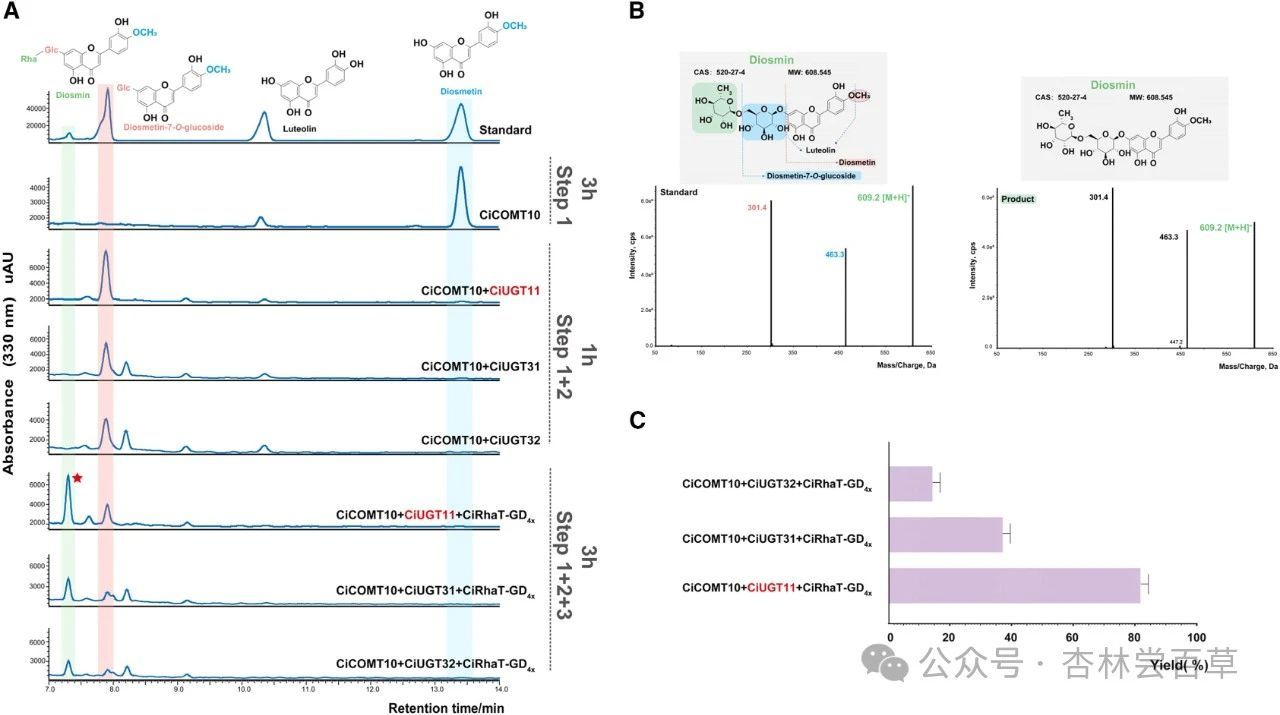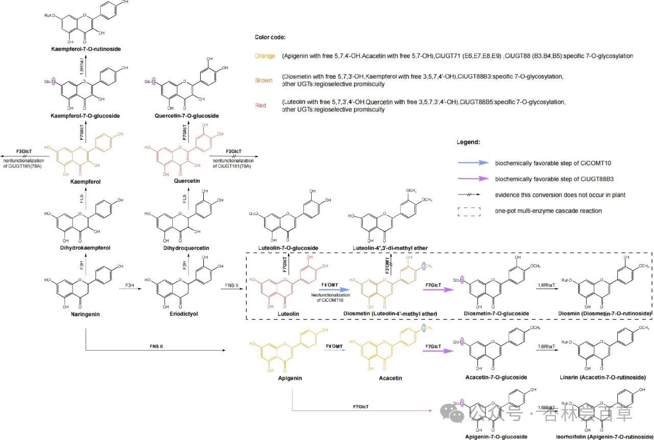 本研究中,作者组装了一个 3.11 Gb 的高质量野菊基因组,重叠群 N50 值为 4.39 Mb,并注释了 50,606 个蛋白编码基因。发现一个串联重复的O-甲基转移酶基因 CiCOMT10 发生了新功能化(Neofunctionalization),特异性催化邻位取代木犀草素(Luteolin)上4'位羟基的甲基化,进而形成地奥司明的重要生物合成前体 Diosmetin。此外,鉴定了糖基转移酶 CiUGT11(UGT88B3)介导 Diosmetin 的7位羟基发生特异性糖基化修饰。最后,作者通过组合CiCOMT10、CiUGT11和之前鉴定的鼠李糖基转移酶(Rhamnosyltransferase),构建了一个一锅级联生物催化系统,从木犀草素出发,实现了地奥司明的高效合成,木犀草素的转化率超过80%。