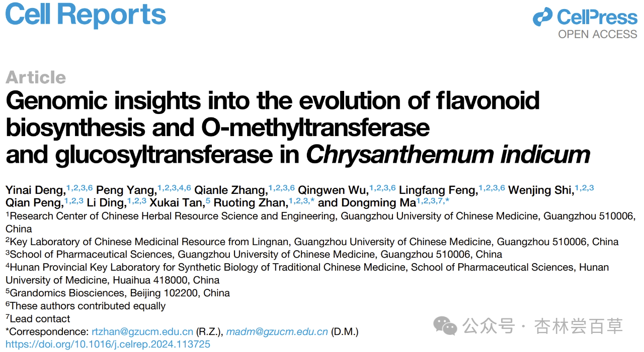 原文信息:Deng, Y., Yang, P., Zhang, Q., Wu, Q., Feng, L., Shi, W., Peng, Q., Ding, L., Tan, X., Zhan, R., & Ma, D. (2024). Genomic insights into the evolution of flavonoid biosynthesis and O-methyltransferase and glucosyltransferase in Chrysanthemum indicum. Cell Reports, 43(2), 113725. doi: 10.1016/j.celrep.2024.113725.