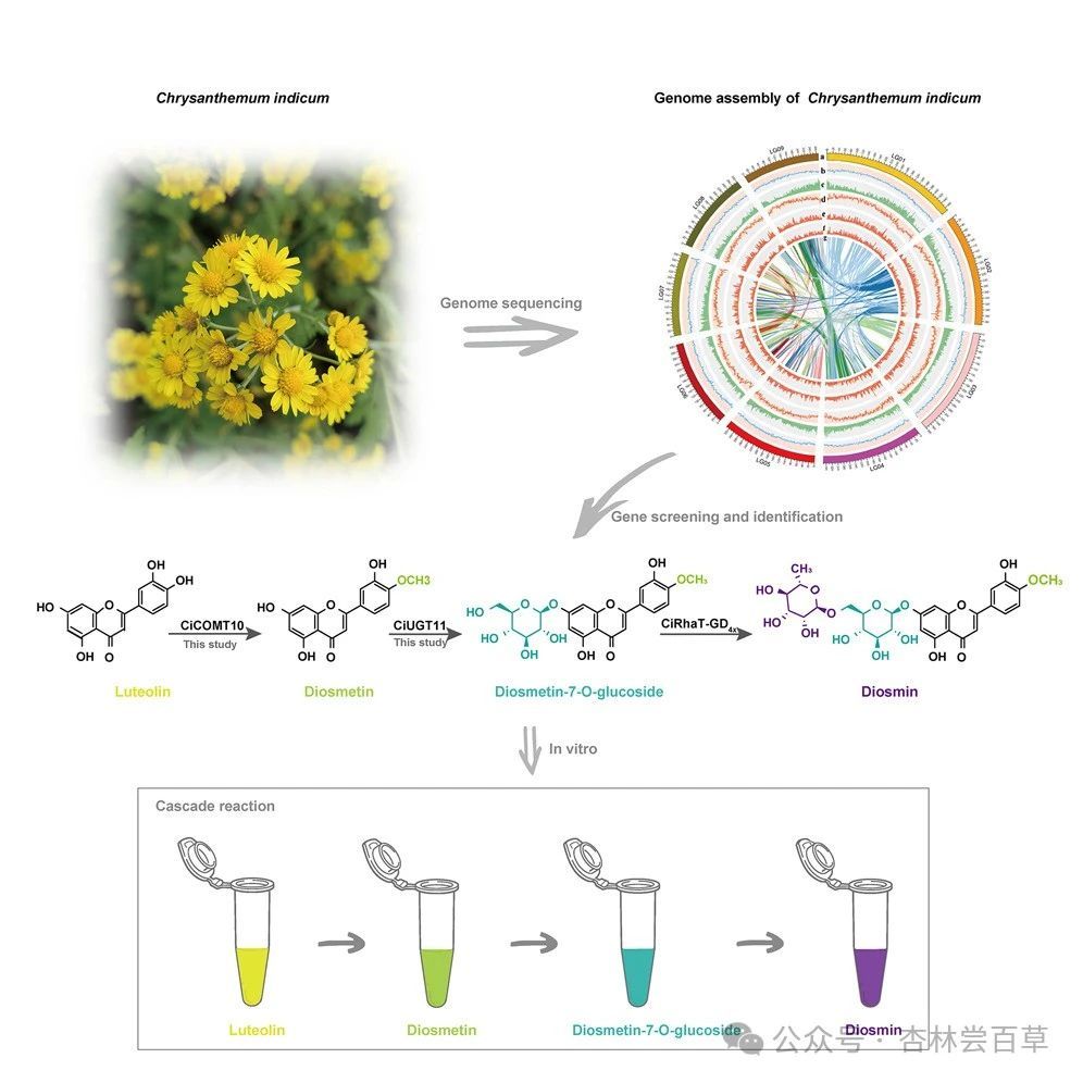 黄酮类化合物(Flavonoids)是一类广泛分布于植物的生物活性次级代谢产物,其结构多样性主要源于位点特异性甲基化和糖基化修饰。地奥司明(Diosmin,Luteolin-4'-methoxyl-7-O-glucosyl-rhamnoside)是一种存在于野菊(Chrysanthemum indicum)中的罕见黄酮苷,为增强静脉张力性药物和血管保护剂,常用于痔疮治疗。菊属植物如何进化出这种新的生物合成能力仍然成谜。